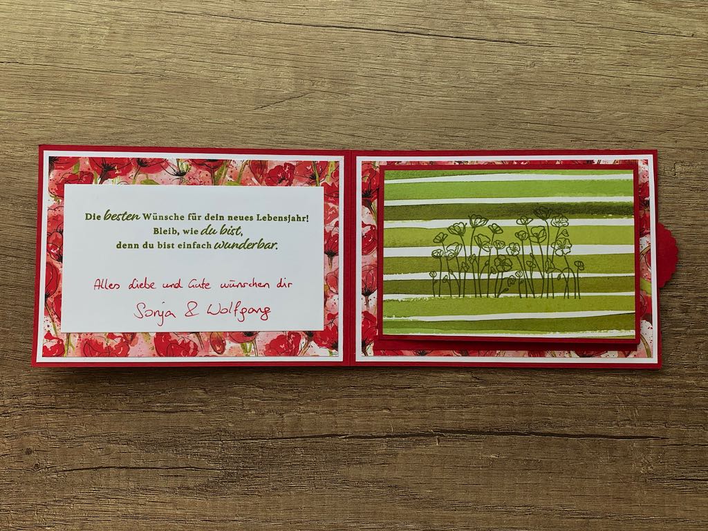 Zusätzlich wurde das Deckblatt mit den Stanzformen “Mohnblüten” dekoriert. Dazu verwendete ich Farbkarton in den Farben Glutrot, Brombeermousse, Farngrün und Olivgrün sowie Pergamentpapier.