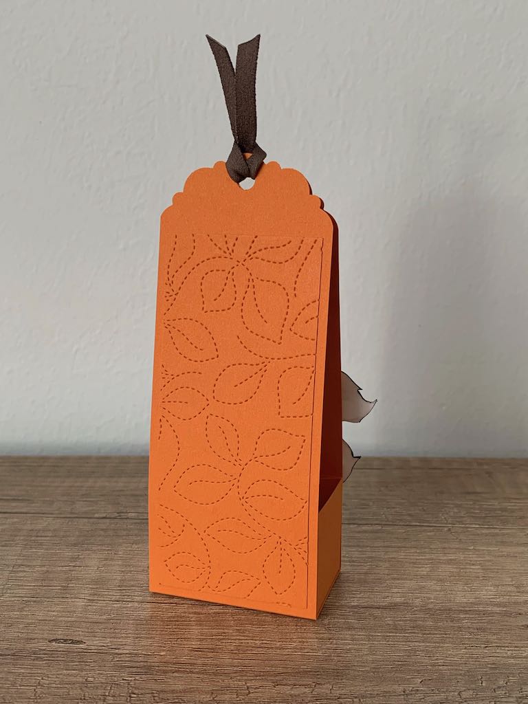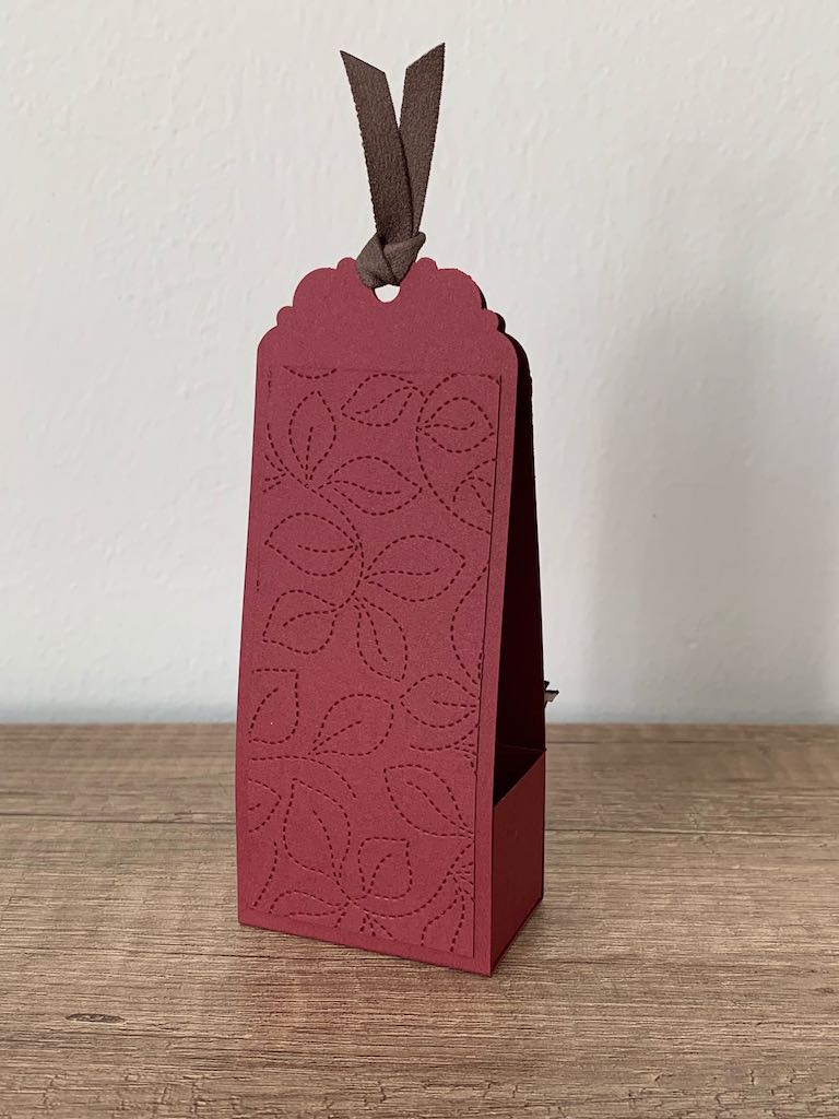 Für die Rückseite dieser Mini-Verpackung wurde ein farblich passender Farbkarton mit der Stanzform “Gesticktes Laub” gestanzt und anschließend aufgeklebt.