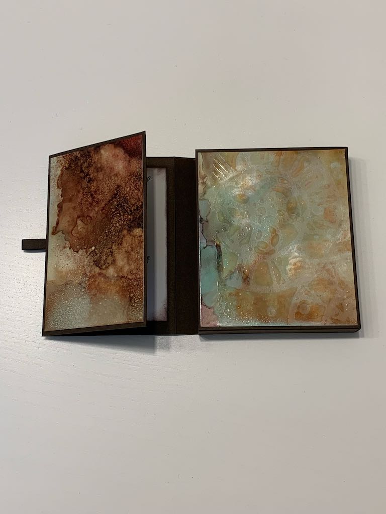 Bei den beiden farbigen Innenseiten handelt es sich um YUPO-Papier, welches mit verschiedenfarbigen Alcohol Inks von Ranger eingefärbt wurde. Zusätzlich wurde auf der rechten Seite noch mit Hilfe der “Tim Holtz Layered Stencil Clockwork” und dem “Ranger Resist Spray” (eine Art flüssiges Kunstharz) dieses Muster aufgesprüht. Ich liebe diese Technik, um damit einzigartige Effekte zu erzielen!