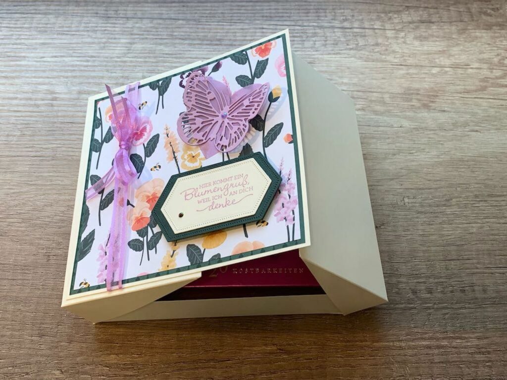 Der Deckel wurde mit Designerpapier InColor 2021-2023 in Lodengrün gemattet, darauf kam ein Stück Designerpapier Stiefmütterchen. Der Spruch stammt aus dem Stempelset “Stilvolle Stiefmütterchen” und wurde mit der Stempelfarbe Freesienlila auf Farbkarton Vanille pur gestempelt und mit Farbkarton Lodengrün gemattet. Dafür verwendete ich die Stanzformen “Raffiniert bestickte Rechtecke”.