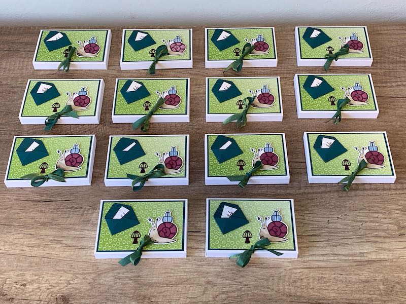 Das Grundgerüst besteht aus extrastarkem Farbkarton in Grundweiß und wurde außen zuerst mit einem Stück Farbkarton in Pfauengrün gemattet und anschließend mit einem Stück Designerpapier “Ombré” in Grüner Apfel beklebt. Darauf kamen dann die ausgestanzten Elemente aus dem Produktpaket “Schneckenpost”. Das entzückende Kuvert wurde aus Farbkarton in Pfauengrün ausgestanzt und der kleine Pilz aus Farbkarton in Brombeermousse. Im Kuvert versteckt sich noch eine kleine Botschaft, die ebenfalls in der Farbe Brombeermousse gestempelt wurde.